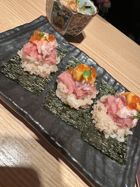 人気の「飲めるサーモン」に「中とろ·塩雲丹·いくら·キャビアの超ご褒美包み」など、オリジナルの極み寿司が自慢な【鮨·酒·肴 杉玉】。他にも刺身や天麩羅に「鯛出汁あさりたっぷりラーメン」といったメのメニューもご提供しております◎全国各