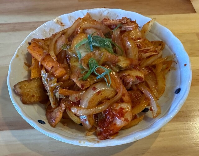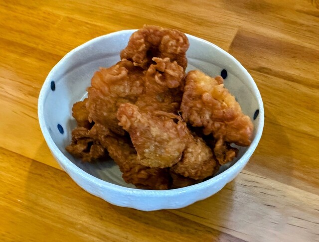 生地の香ばしさが際立つ、外カリ中トロのたこ焼き。焼きたてを頬張ると、熱々の生地がとろけ、タコのプリッとした歯ごたえがアクセントに。ソースの甘みとコク、青のりの香りが絶妙なバランスで絡み合います。王道の味ながら、丁寧な焼き加減でワンランク上の仕上がり。シンプルに見えて、細部までしっかりこだわりが感じられます。
