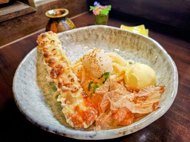 JR学研都市線四条畷駅より徒歩3分 四條畷神社に向かう参道にございます。 細打ちながらコシのよいうどんと揚げたての天ぷらをお楽しみ戴きます。一品料理や旬な酒のあてもご用意いたしました。