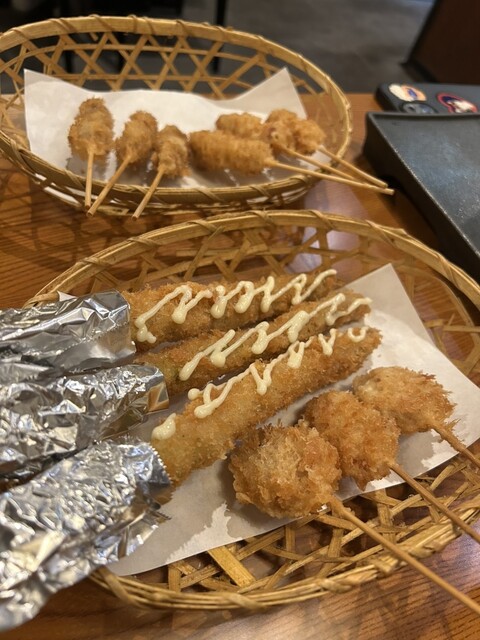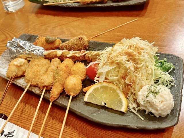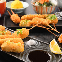 串揚げは、定番の肉・野菜からうなぎやデザートまで揃えた多彩なラインナップが自慢◎試行錯誤の末に辿り着いた軽やかな衣でお楽しみください。飲み放題付コースは4,500円~で、薩摩黒豚のしゃぶしゃぶと串10本が堪能できるプランが一押しです◎串揚げセットやとんかつなど、ランチメニューも充実。2階に座敷個室完備、1階フロアは15~22名様で貸切も可能ですので、さまざまなシーンでのご利用をお待ちしております。