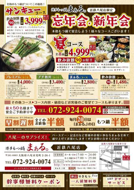 ”飲み放題付コース3999円!4999円!!☆【くせになる味!焼きもつ】 当店の厳選素材「国産牛もつ」は、焼いて食べても「ぷりっぷり」 「とろける」感触が口の中で広がり、クセになること間違いなし!《まぁる八尾オリジナル3大企画》 ①早割・遅割(18時まで又は21時半以降のご来店で→→→ALLドリンク半額!! ②毎月20日はまぁるの日!もつ鍋半額フェア開催しております! ③チョーお得!クーポン企画!