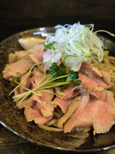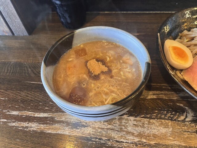 つけ麺 (並)2玉 9杯目 (豚骨+魚介 1350円) ★★★★★ スープは豚骨ベースの魚介醤油味。麺はややウェーブのかかった4.25mmの太ストレート麺。具は肩ロースとバラ... 詳細を見る