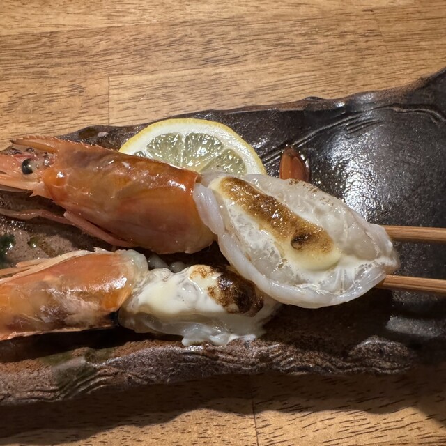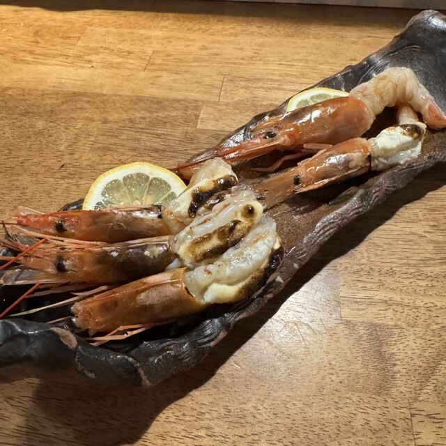 名物の「ほぼ生エビマヨ」は、プリッとした食感と甘み、炭火の香ばしさが相まって必食の一品。