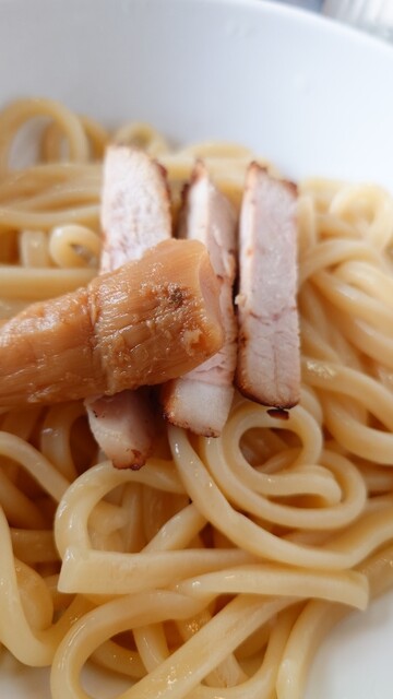 麺側には炙り細切チャシュと極太メン...