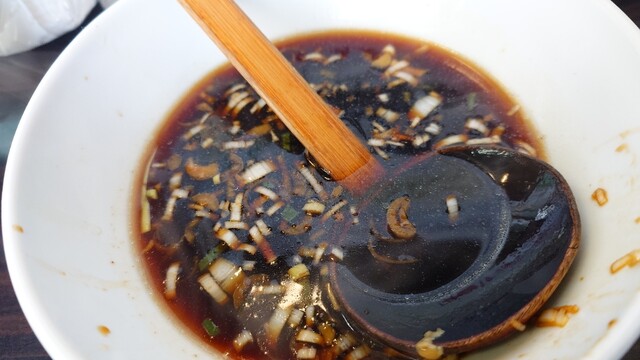 プッカリ温玉とネギが浮いた、パンチあるショウユ+ワッフ~感あるつけ汁♪