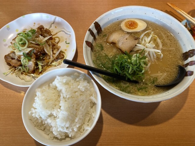 豚骨醤油ラーメンにライスと油...