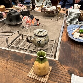 優しい炎を宿した囲炉裏が主役。炭火で丁寧に焼き上げられた、四季折々の自然の恵みを食らう