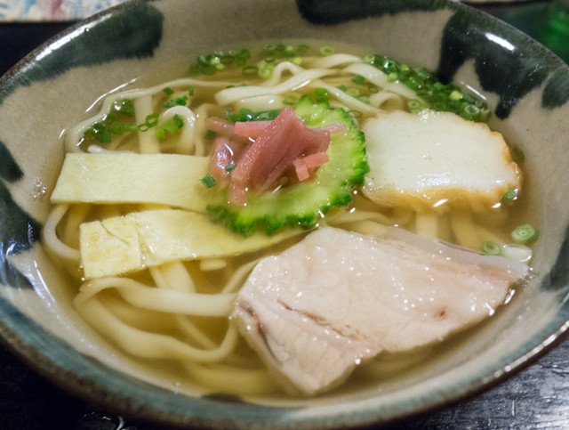沖縄そばは鰹出汁をベースに三枚肉を炊いた汁を加えてあり、繊細でありながら旨味もたっぷりだ。