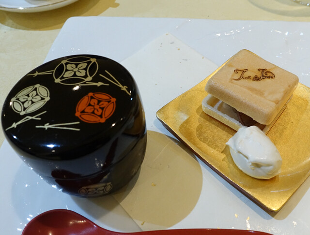 前菜はトゥラジョアの金属の箱に入ったもの。ホタテ、干し貝柱の出汁のシート、トリュフ玉子(鶉)、バフンウニなど 一見あわなさそうで、シェリービネガーが調和させる。