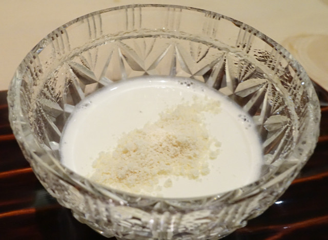 最後に雑炊というかおじやになるのですが、これがまたすごいもの。雑炊用に特別に炊かれたお米に卵の白身だけを入れてかき混ぜながら水気が少なくなるまで炊いていきます。三回に分けて供され、最初の一回目は米の香り お日様のようななつかしい匂い。