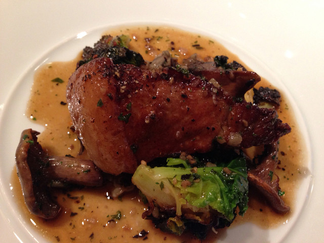 デュガの赤をオーダーし、お次は的鯛のポワレ、キノコとキャベツのピューレ、マトロートソース。