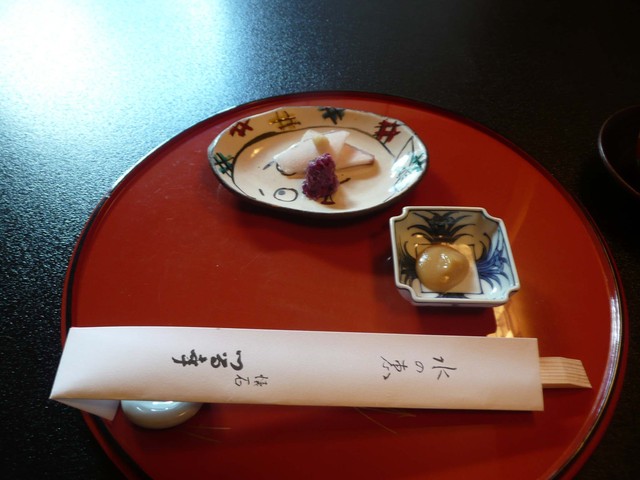 お勘定を待っていたら、和菓子と抹茶を出していただきました。小京都加賀の有名料亭で、抹茶って、す て き。しかも、私昔、裏千家の手前を少しかじっていましたので、懐かしくもありました。