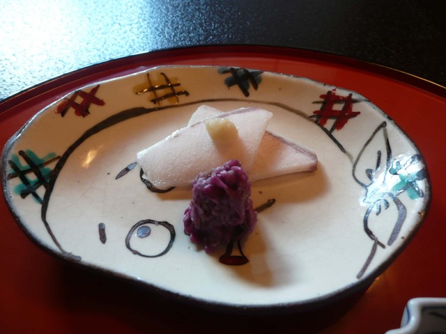 次は、加賀野菜三昧です。源助大根や金時草、金馬人参、金時人参、太きゅうりのだし汁ドレッシング掛け、黒モズクのざくろ載せと自然薯のラディッシュ載せでした。こちらの料理長は細君が私に野菜を食べるように言っているのを聞いていたのかなぁ?でもおいしかったです。加賀野菜を堪能しました。