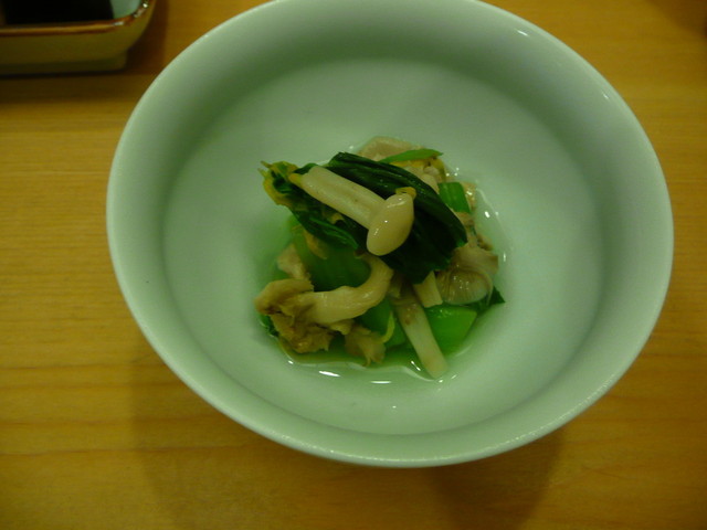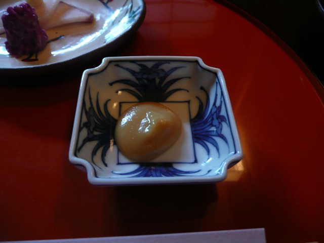 あられが入った、お茶を飲んで、気を静めてから、ブリのルイベを頂きました。北海道料理で有名なルイベを金沢で頂けるとは思いませんでした。食用菊が淡い赤紫色でしたので、もって菊ですかと聞いてしまいました。食用菊の中で、もって菊が一番好きな森の里5です。