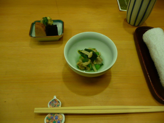 次がお作りですが、銀杏、紅葉、松葉があしらってある蓋(?)で覆ってあります。それを取ると、ぎっしり詰まったお刺身です。「ラー油を一滴落とした甘海老は最後にお召し上がりください」って、最初に言うな、食べたくなるでしょうが。あとはタコ、アボガドのマグロ巻、才巻海老(これもうまかった!)、バイ貝の焼き霜造り、氷見〆サバ、芽ネギの白ガレイ巻、赤イカのもみじ子乗せ、七尾湾の赤西貝。これらを梅肉醤油と普通の醤油で食べ比べました。本生わさびがすごく効いていて、お刺身がおいしい!梅肉醤油が残っていたので、通常私は食べない台座(写真では白ガレイ、大葉の下)を食べてみたら、大根ではなく、長芋でした。思わず、全部食べてしまいました。うれしい誤算です。