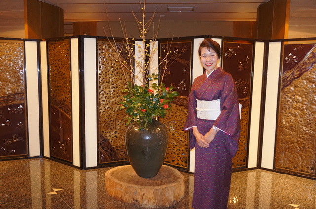 フロントで受付を行ったとき、フロントの女性が女将さんに電話連絡されたようで、大谷徳子さんがご挨拶に出てくれました。今回は、きれいな、春らしい浅葱色のつけさげに、白の名古屋帯でした。いつも、笑顔が素敵です。今回も、お写真を撮らせていただこうとしたのですが、今回は、もう、恥ずかしいのでと遠慮されてしまいました。そのため、徳子さんのお写真なしです。(泣)