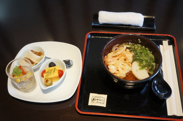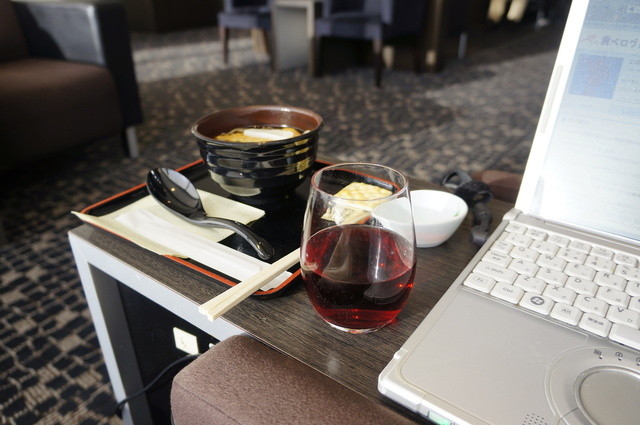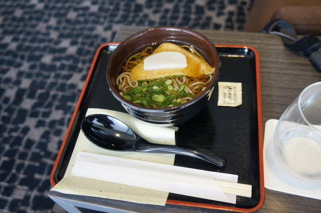 今回も、SUITEラウンジに入ったら、美人地上係員さんが、何かお持ちしましょうかって、来て下さったので、キツネそばとお酒をお願いしました。