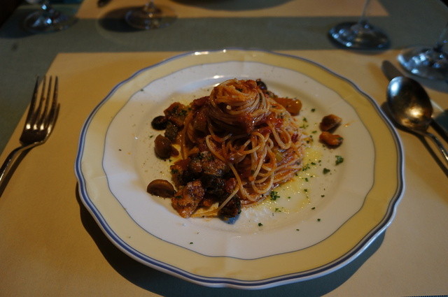こちらでは、ピッツアは石窯で焼いており、カリカリしていながら、柔らかいです。周辺部が膨らんでいないので、ナポリピッツアではないようですね。お聞きしましたら、ローマ系のピッツアだそうです。モッツレラチーズが良く合っています。最終的にピッツア2枚は多すぎたので、半分ほどお持ち帰りしました。