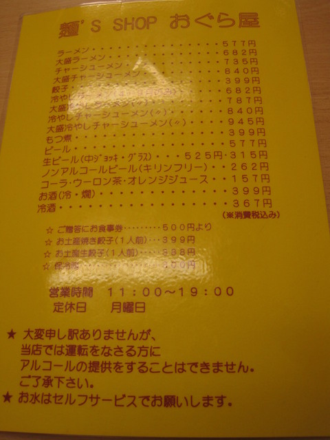 ラーメン:577円、大盛ラーメン:682円、チャーシュウメン:735円、