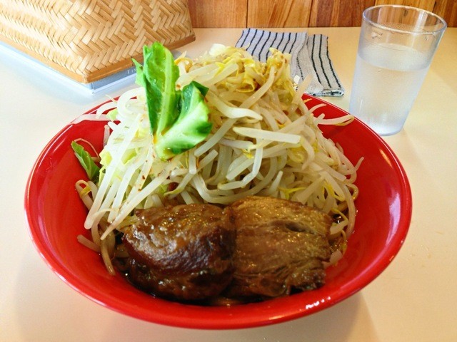 どうやら、この店のラーメンは、まぜそばとなっているようで汁が少なめなのが特長のようです。一見、油そばのようですが、たっぷり野菜(もやし)と麺をよくかきまぜてからいただきました。すると、なんともジャンキーな味ですが、たしかにジロリアンラーメンの味がして、癖になる美味しい味です!