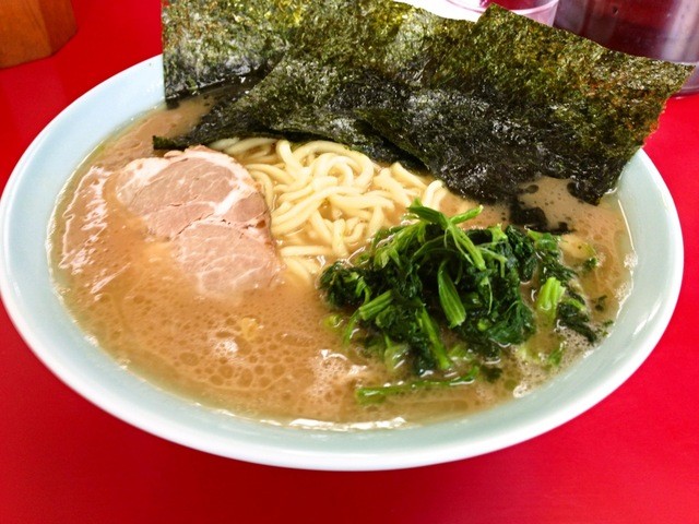 見た目は白濁した醤油豚骨スープにトッピングでチャーシュー、海苔3枚、ほうれん草が入ったオーソドックスな家系ラーメンです。
