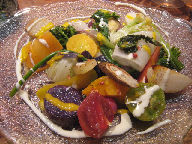 10種類以上の野菜を、一つ一つ、研究して別の時間で湯搔き、丁寧に仕上げてくれる、地野菜のサラダが絶品。これが白ワインにピッタリ合います。思わず、サラダを2皿頂いたこともあるぐらいです。