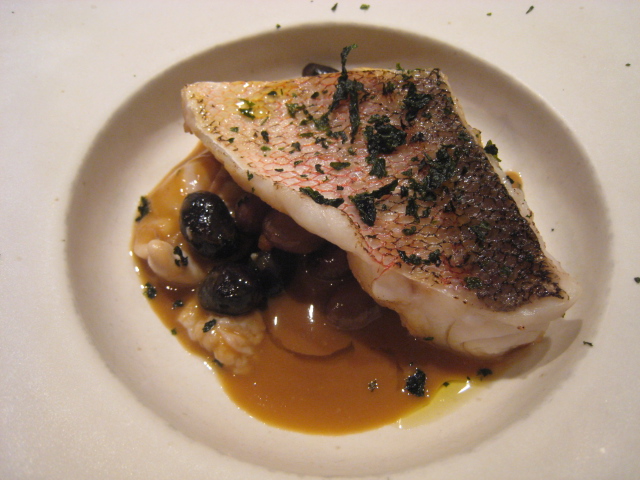3)グジ・桜鯛の白子・黒豆・モロッコ豆、軍鶏と地鶏のブイヨンと金時人参ピューレ【写真】