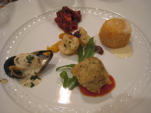 1)トラフグ、アワビ、タコのフリット