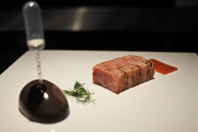 赤ワインソースの球体があり、それを潰して頂くのです。