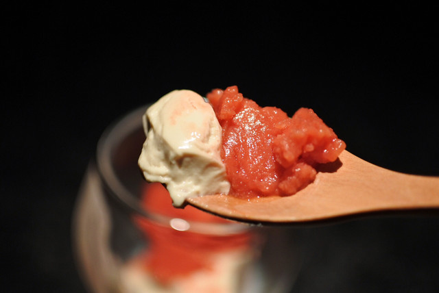 出来上がったシャーベットを沖縄産の黒糖を使ったパンナコッタに乗せて出来上がり。