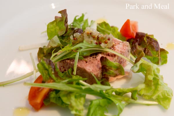 パテに乗っかったピクルスと粒マスタードのソースが清冽で良いアクセント。もちろん、臭みもなく口当たりもとても柔らかい。赤ワインとよくあった。