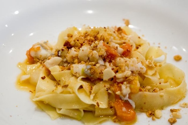 タッコーニとは平たい四角のショートパスタだそうでイタリア語で靴のかかとという意味と説明してくれた。上に振りかけられているのは香草パン粉。シチリアではチーズの替りにパン粉をかけることがよくあるらしい。