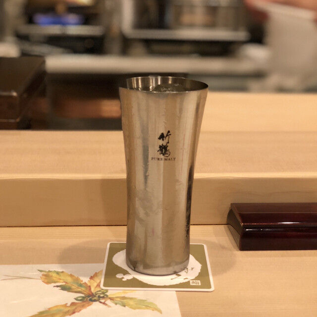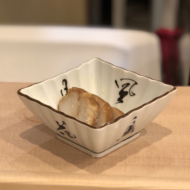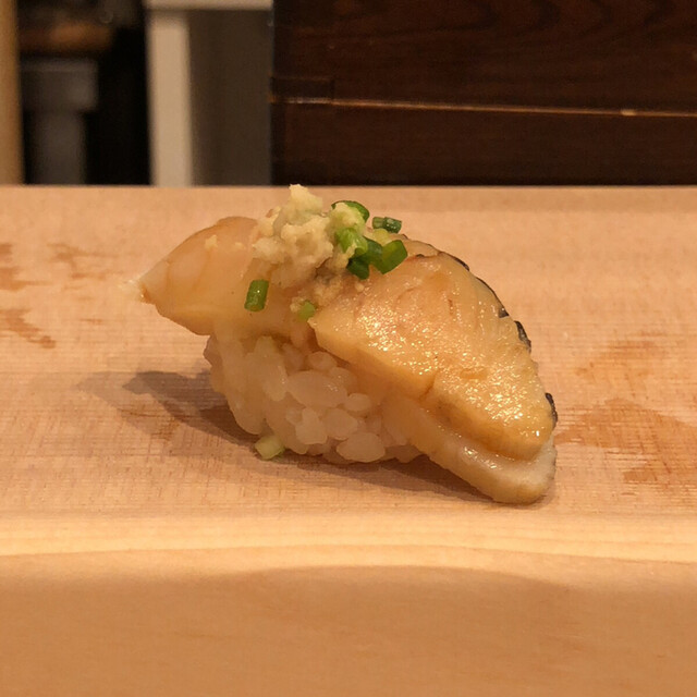 この日はコースでいただきました。まずは握りの前におつまみとして、無花果と蒸しアワビ、真鯛、かつおの燻製オニオンソース、特大ホタテの磯辺焼き、メヒカリの一夜干し、ジャガイモとトビコのオリーブ和え、里芋煮、紫蘇梅肉の茶碗蒸しと続きます。どれも日本酒が欲しくなるようなばかり、乾杯のビールをクイッと空けてすぐさま日本酒にチェンジです。