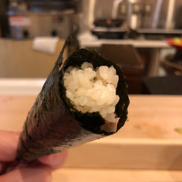 握りは生まぐろのトロにはじまり、鯛の昆布締め、赤身の醤油漬け、こはだ、〆サバのバッテラ、鰆の昆布締め、生いくら、イカ、アナゴに厚焼き卵と続き、最後は南高梅と鰹節の手巻きという内容です。握りの方もどれも文句なし、ツマミの時点ですでに確信はしていましたが期待どおりに美味しかったです。特に濃厚で甘い脂のまぐろととろけるような柔らかさのアナゴは絶品、何貫でも食べられそうなくらいでした。