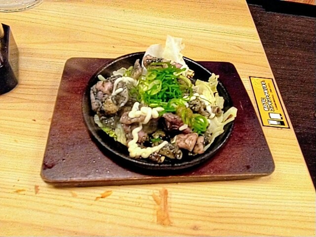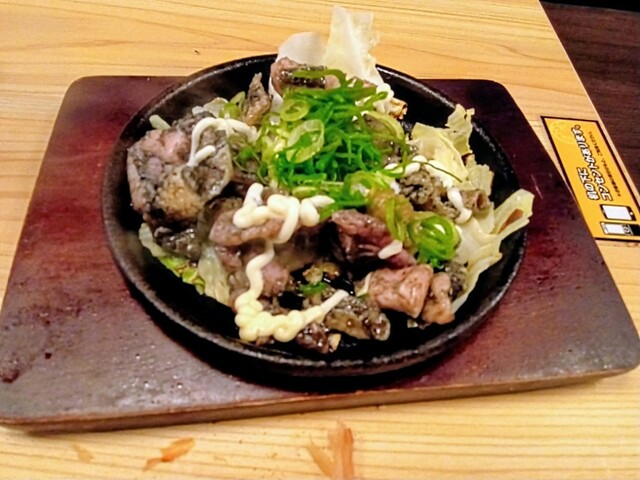 『親鳥鉄板焼~柚子胡椒マヨ~』(390円)…小さな丸い鉄皿に親鳥とキャベツが乗せてあり、ジュージューと音を立てて良い香りがしてます。