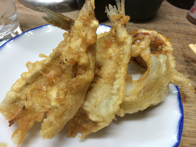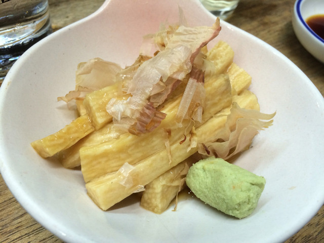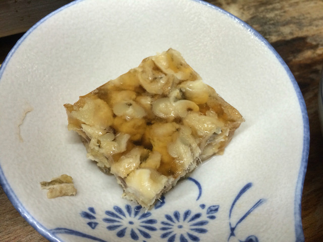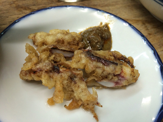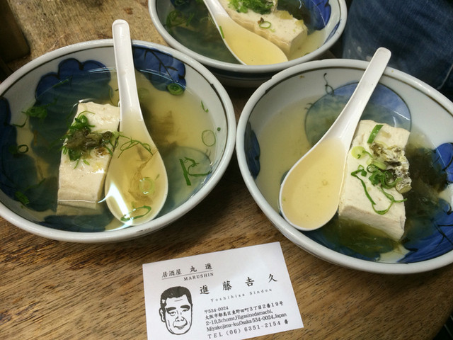 右端の方に立っておられた大将が、遠くから初めての客はいるかと大声でこちらに声がかかり、3名は初めてだと答えると初訪問客へのサービスと湯豆腐が3人前と下足フライをいただきました!
