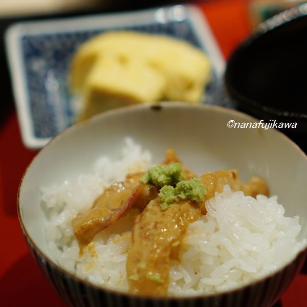 ご飯、胡麻ダレで和えた鯛の切り身、