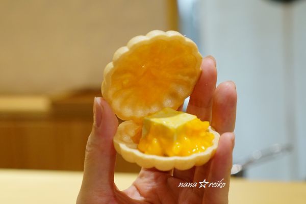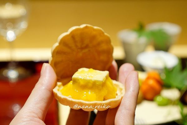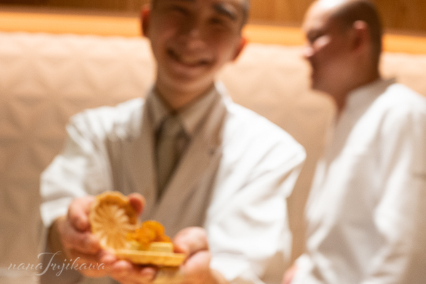 あんぽ柿フォアグラ最中(二人入れようとしたらボケました・・・)