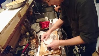 仕込み中の電話応対。