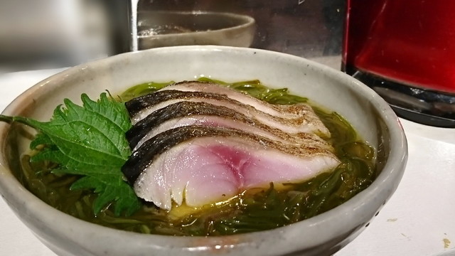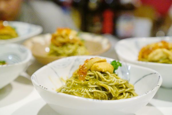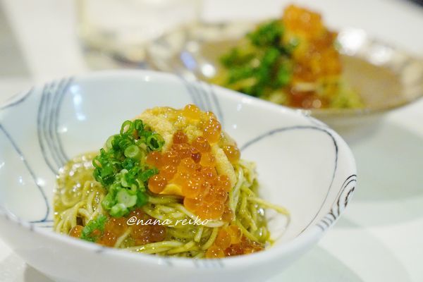 アワビの肝冷麺ウニイクラのせ