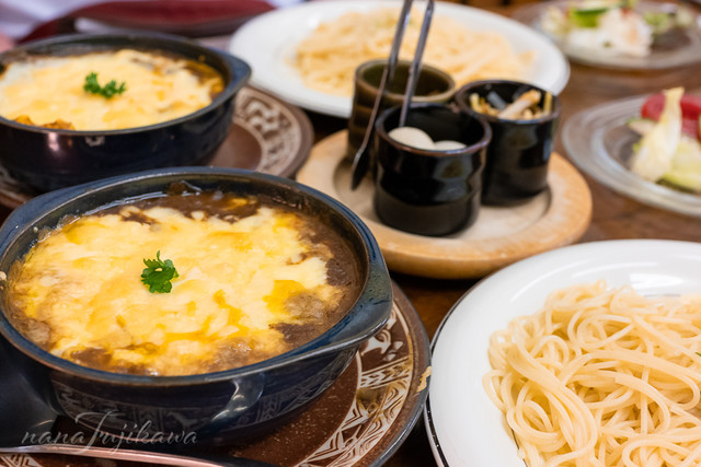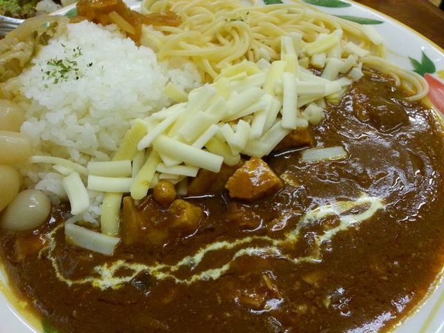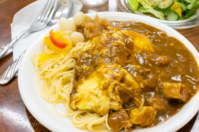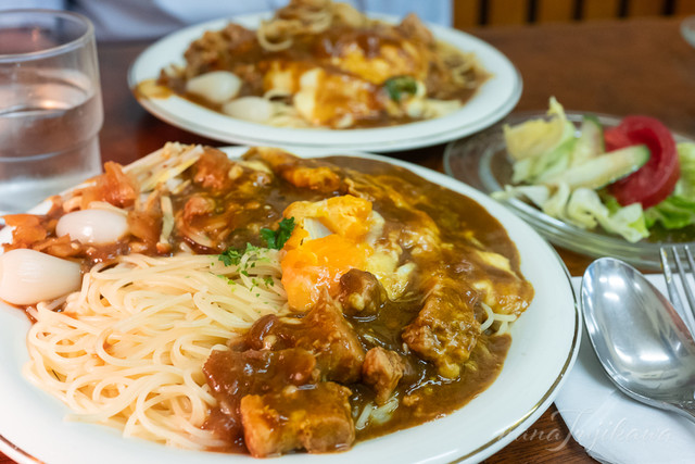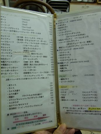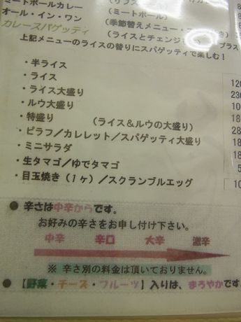 約20種のカレーライス、カレースパゲティ、ナポリタンとメニュー豊富。カレーの辛さを選びます。