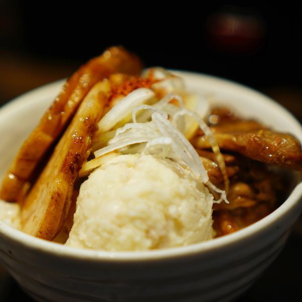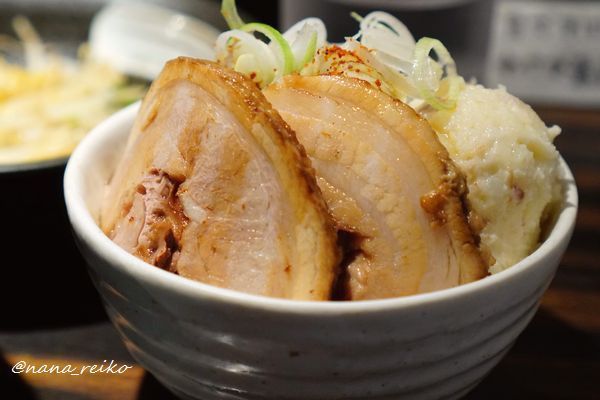 並商ごはん300円!チャーシュー2枚、煮込み軟骨、ポテトサラダ、ネギが乗っている!
