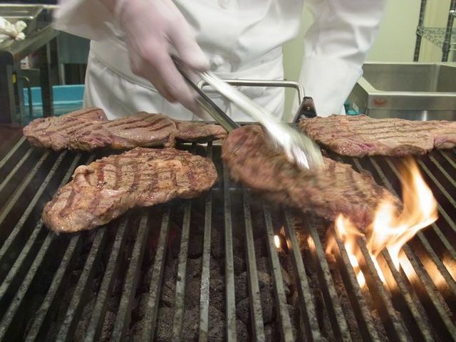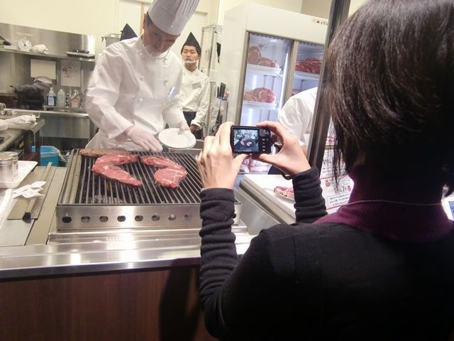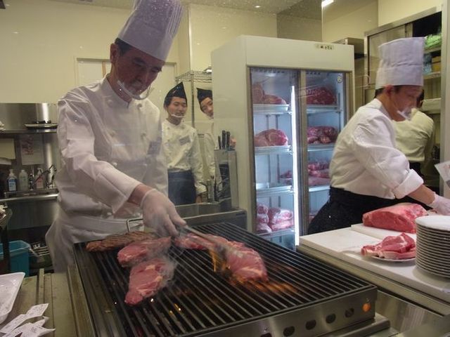 ステーキを焼いてるところ。ステーキをカットするカット場もオープンキッチンで見えます。