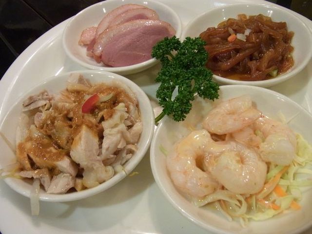 @【前菜】四種冷菜盛り合わせ。バンバンジー、合鴨の冷菜、くらげの冷菜