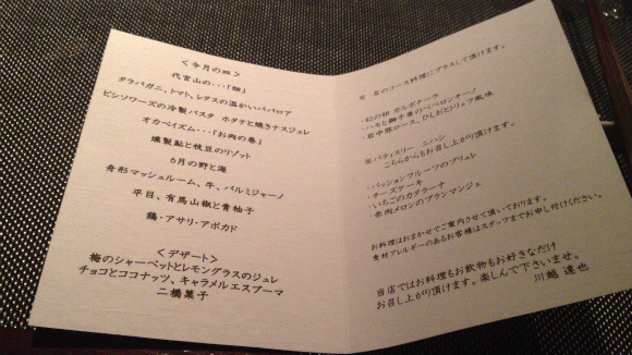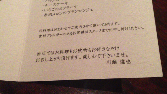 ☆川越シェフのレストラン / 水もお酒も飲み放題で感動 / 手書きの手紙をもらってまた感動☆ (2013/07/01)