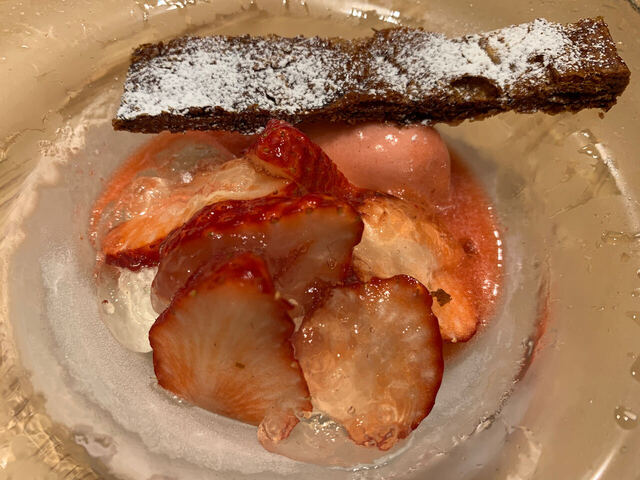 プティオードブルから始まり、フォアグラは酸味あるソースとの相性も良く美味しくいただける。ただ魚料理も肉料理も大味な印象が残った。鮭のムニエルではもっとフレンチらしいバターを効かせたコクのあるソースだったり、牛のローストだってもっとソースに絡むようなアクセントが欲しい。グラスワインは白と赤を頼んだがこちらも印象に残らず。5年前のレビューにも同じ事が書いてあるがデザートが美味しい!スムージーはジャスミンのジュレと蜂蜜とヨーグルトの味わいが絶妙で爽やかな気分になる。コーヒーも美味しい。料理の印象は5年前と同様でデザートがこの日の一番です。