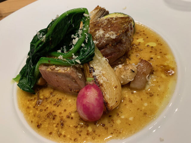 「メヒカリとキッシュ」はパルミジャーノレッジャーノをかけてもらって食べるのだがどんな味なのか想像できなかった。メヒカリの苦味にチーズの旨味とともにほうれん草やベーコンにしらすのキッシュも合わせて楽しめた。