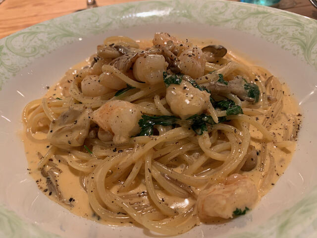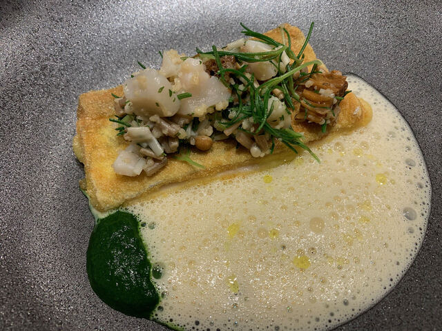 魚料理は鱈と白子だ!白子ソテーにカプチーノソースは相性よく濃厚なコクを味わえたが、鱈の身とはいまいちソースが絡まず味気ない印象だった。