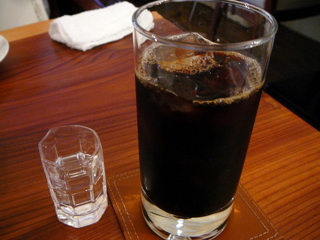 丁寧にドリップするためか供されるまでは多少の時間を要する。そして珈琲が出る直前にはミルクが供される・・・氷と水が入れられたグラス皿に小さなミルク入れの容器(それも2つ)が浸されている!何というこだわりだろう・・・感動を覚えました・・・でも普段自分はミルク使わないんだけどね。
