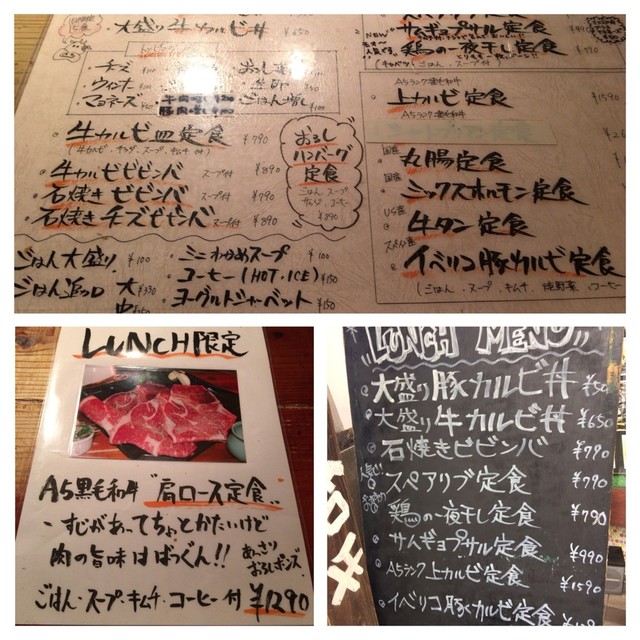 大盛り豚カルビ丼500円から1580円の上カルビ定食まで。